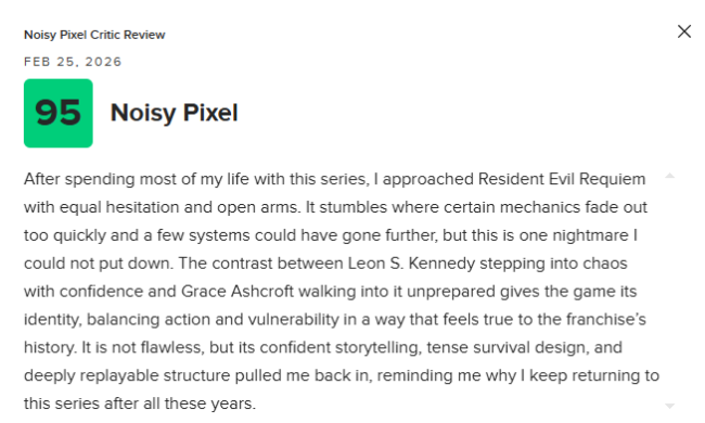 《生化危机9:安魂曲》宛如安布雷拉公司地下实验室进行的一场成功实验,巧妙地将两种截然不同的生存恐怖亚型拼接在一起,融合成一种极具传染性的全新变种。它标志着一位系列传奇角色的回归,同时也迎来了一位讨喜的新主角;它将血腥暴力提升至令人作呕的新标准,并释放出更恐怖的丧尸变种。缺乏像“佣兵模式”这样有意义的额外内容确实有点令人失望,同时我也在思考,游戏在紧张得令人咬牙切齿的时刻与全面开火之间的节奏起伏上,或许可以找到更连贯的平衡点,而不是将惊吓主要集中在故事的前半部分,让后半段演变成更密集的枪战。即便如此,从我最初颤抖着步入其阴影,直到尾声那场震撼人心的巨型Boss战,《生化危机9:安魂曲》无论是让我毛骨悚然,还是让我尽情开火,都始终让我完全沉浸其中,并持续获得乐趣。